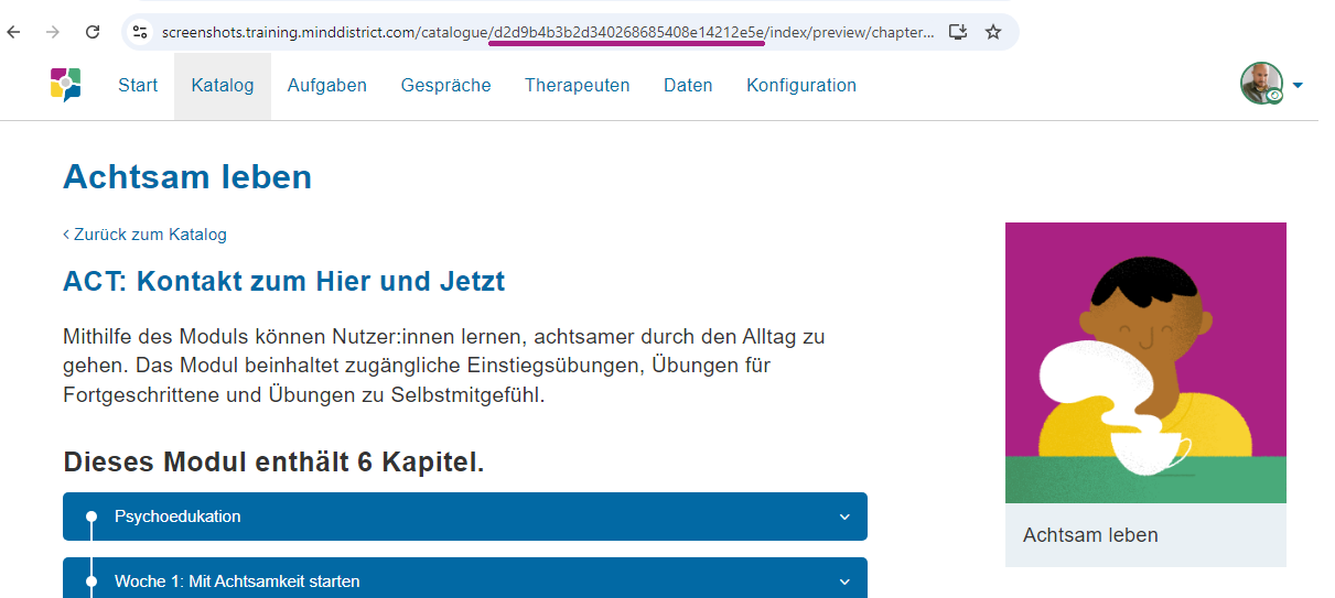 Module oder andere Tools, wie Fragebögen oder Tagebücher, haben eine eindeutige ID. Diese ID finden Sie im Katalog und nie über ein Kunden- oder Professionellenkonto.